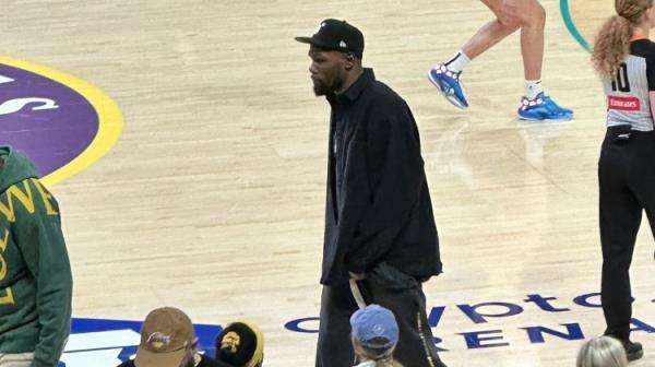 太阳球星杜兰特身着黑色球衣来到现场观战。