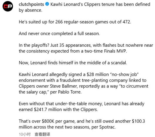 美媒:莱昂纳德在快船已赚超2.4亿美元,仅出战301场,每场净赚80万